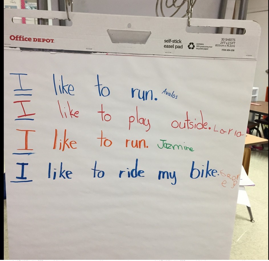 The teacher then writes "I like" and has a student say what they like followed by the students initials to show ownership of the sentence. The teacher then continues the list for other students. Students can then practice reading the sentences with a pointer. Below is a picture of Ms. Avalos' kindergarten class who just completed a predictable chart. Ms. Avalos turned her predictable chart into a shared writing activity.