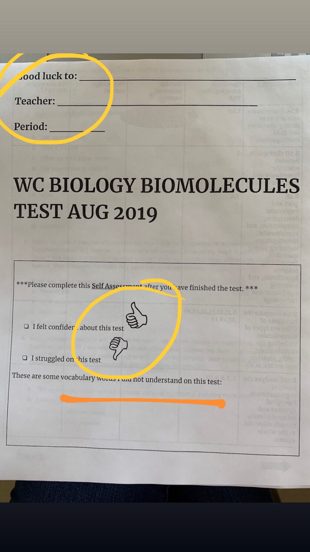 Lastly, I think self-assessment is an important piece of growth mindset as it helps students communicate their understanding. One way I like to do this is by a “thumb-ometer” followed by a think-pair-share to address questions that arise from students who hold up a sideways and thumbs down. After using this strategy often in class, I started putting this “thumb-o-meter” on quizzes and tests as a way for students to self-assess their learning and explain where they may need more support. (Below is a picture of a quiz I created modeled after https://mathequalslove.blogspot.com/). It was helpful for me as a teacher to read feedback from students and after sorting them into three piles, I could make homogenous or heterogenous groupings. Another idea to include on formative assessments was a vocabulary strategy I learned at the training mentioned above. The presenter suggested having students circle any unknown words as a way to help them pinpoint where they were struggling. After sharing these ideas, the dean mentioned above sent me this second picture of how she added these on her first biology test of the year.