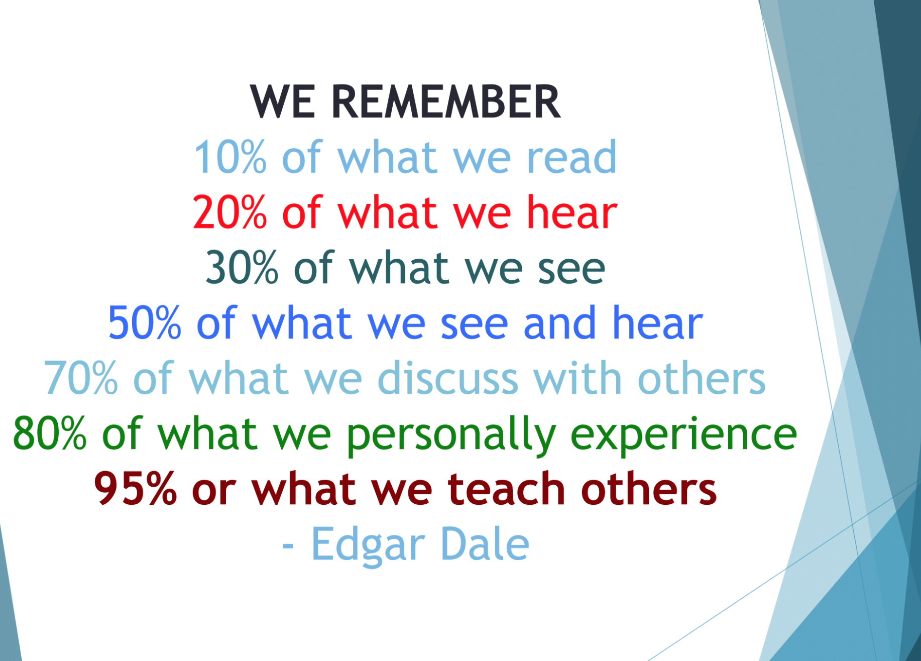 Holding guided discussions between students is so important when processing new learning. It gives students an opportunity to orally respond to new content and also listen to others who are processing that same content with them. Discussions also provide material to put into student's writing. Discussions always come first and then the writing follows. Edgar Dale also tells us "We remember 70% of what we discuss with others." Thats an astounding fact to think about as educators!