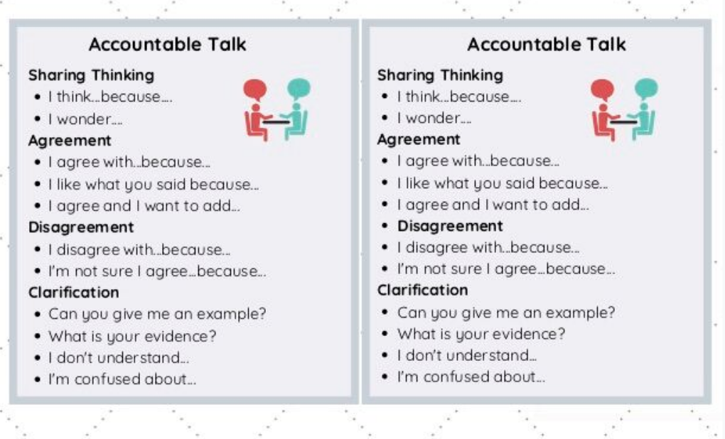 Discussions are an opportunity for our ELL students to practice a new language. Not only will they be speaking but they will be hearing other's modeling using language as well. Practice makes proficient. A great tool for helping all students acquire appropriate language is by having each student use an accountable talk card.
