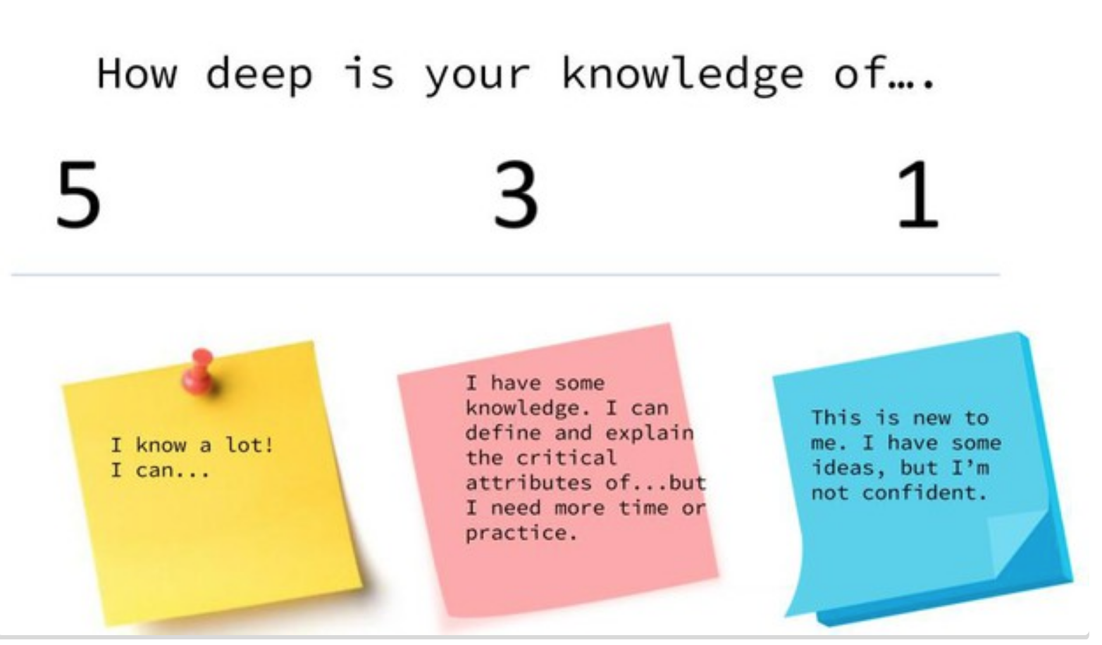 - 5*3*1 charts-Give each team or student a 5*3*1 chart at the beginning of class. Have them put a sticky note under the number that best describes where they are in relation to the learning target. 5's think they are experts, 3's are working towards mastery, 1's are novices just starting the journey. At the end of class, ask them to rate themselves now. Ask students to defend their rating using the learning target, success criteria, and their evidence of learning (products or performances created during the content block).