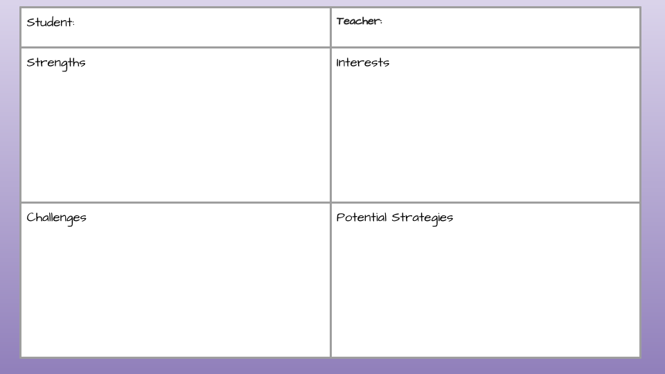 During a conference session with Nicole Dimich this summer, she shared a "one pager" where information is gathered for and with each student. This helps to form theories about how the student learns best and why the student might struggle. Many students will have gaps this year, so gathering the data and working from what the student already knows is a critical starting point.